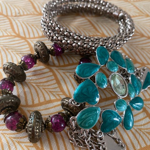 Kjede med klare stener, mange armbånd, arabisk halskjede og strass pynt til pannen(festes i håret)
