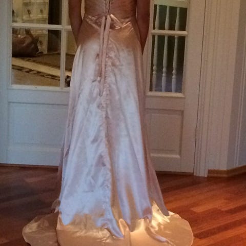 Kjolen har to lags underskjørt hvorav en av dem er tyll. Ikke brukt mere enn et par ganger, men har hengt lenge i skapet, så du vil ikke dukke opp i samme kjole som noen andre i selskapet 😄