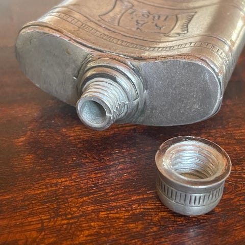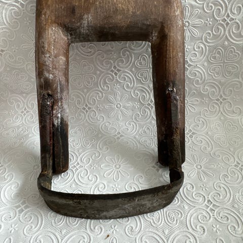I metall, med tre håndtak. 16 cm l og 7 cm b. Alder antatt fra sent 1800 til tidlig 1900 tallet. Den er hel både i metall og treverk.