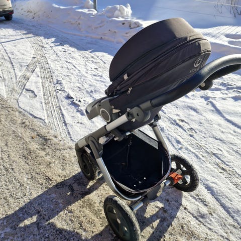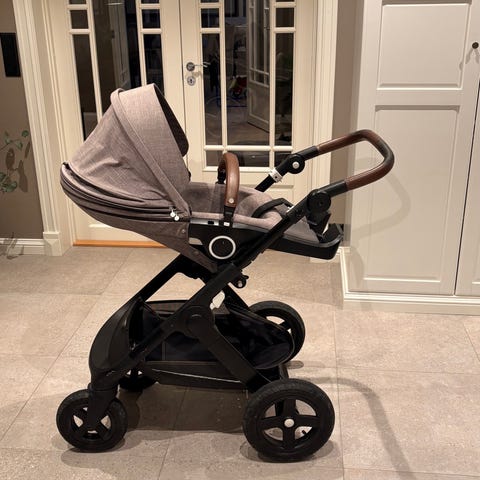 Kjøpt ny i 2020. Stått på lager og lite luft i dekkene. Ellers en god vogn. Bilstol til baby som kan festes rett på vognen og sportssete. Kan selges separat. Gi bud.