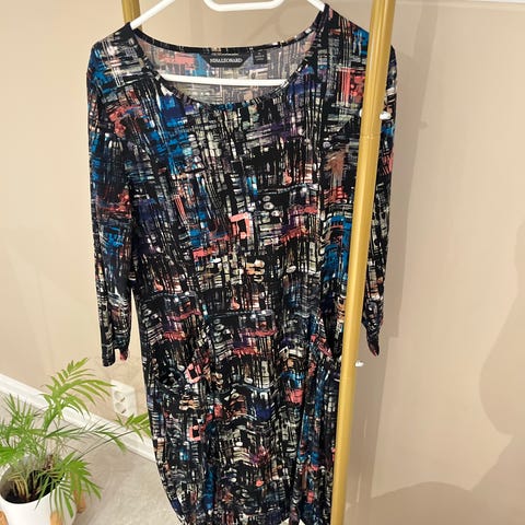 Tøff kjole fra Charles selges da den dessverre ikke passer meg. Supergodt materiale med "rynkekant" like under bysten så den faller veldig pent over magen. Mønsteret er fargerikt og kan kombineres med mange forskjellige farger, både i strømpebukse og cardigan.