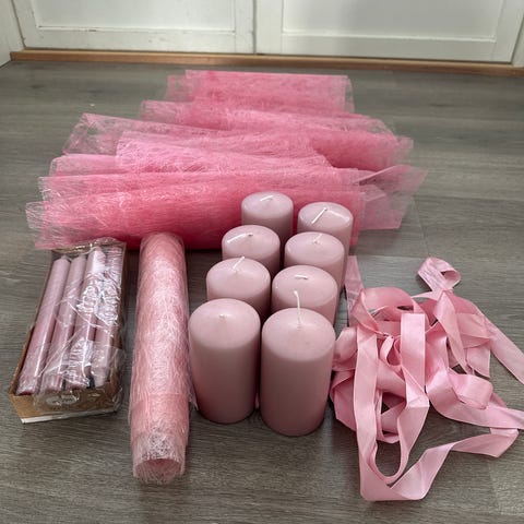 Lilla pynt brukt i konfirmasjon. 5 løpere, en pose roseblader, 7 små engler til feks 1 blomst i hver, 7 engler til telys (tror ikke di tåler ekte lys, sender med noen led, mulig di trenger nye batterier), en pakke med sommerfuglpynt til å feste rundt muffin/cupcakes. Litt hjerter og en halv pk serpentiner