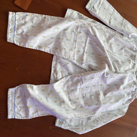 Flanell herlig myk og varm behagelig flosset nattdrakt, jakke og bukse med strikk i livet på buksen. 100% bomull. Løs og ledig i størrelse medium (selv om den originalt fra England er merket xl). Armhule til armhule 55 cm, hel lengde 69 cm. Bukselinning 78 cm. Benlengde 102.5 cm hvorav 4. cm dobbel kant inkludert. Nyvasket. Ikke slitt, lite brukt, fremstår som ikke brukt. Kan sende.