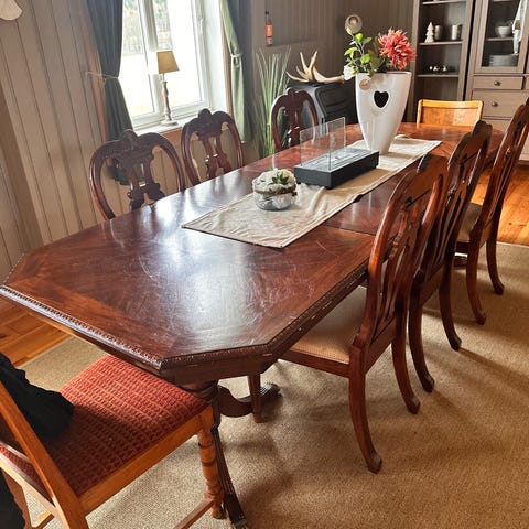 Spisegruppen ble kjøpt i sin tid på bestilling i Drøbak. Bordet er laget av tømmer fra en gammel lagerbygning på Alnabru. Bordet er kraftig og nylig pusset. Hvis man ikke liker slitt utrykk er stolene lette å male samt trekke om. Det er en solid spisestue, lett å pusse opp og vil fremstå som ganske ny. Pris kan diskuteres