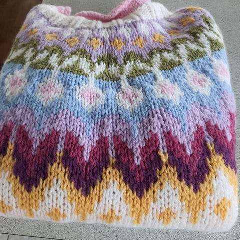Hjemmestrikket mariusgenser i ull. Den passer ca en størrelse 14 år