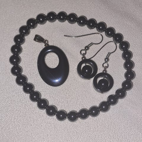 Smykke og armbånd . Spenner og en "diamant" lignende stein av rhinestone . Svarte perler som er acryl basert .