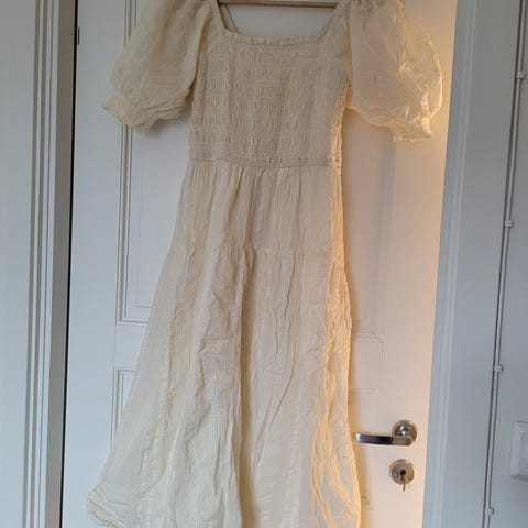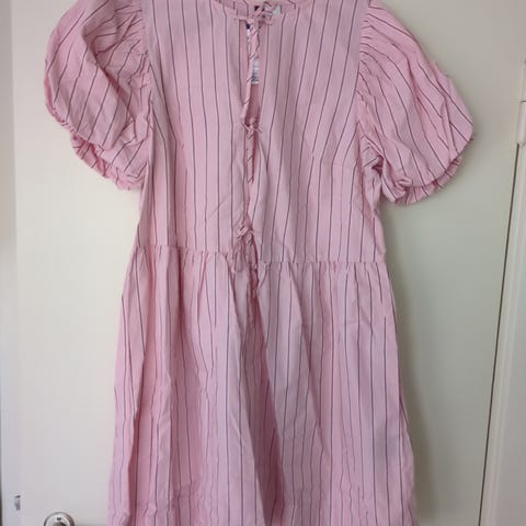 Kjempe søt kjole i nydelig lys lilla farge med sølvdetaljer. Knyting i ermene og luftig passform. Litt skrukkete pga oppbevaring bare.