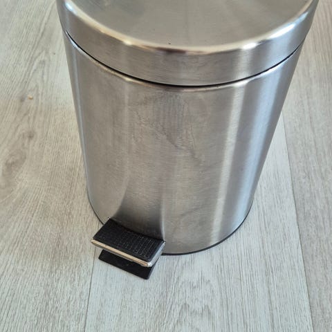 Søppelbøtte i matt sølvfarge. Har litt merker her og der etter bruk, se bilder.