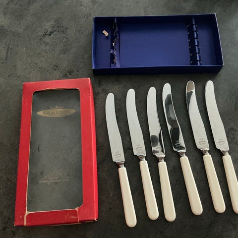 12 Spisekniver Rokokko tinn, 2 x 6, ligger i eske , urørt, har aldri vært ute av eskene