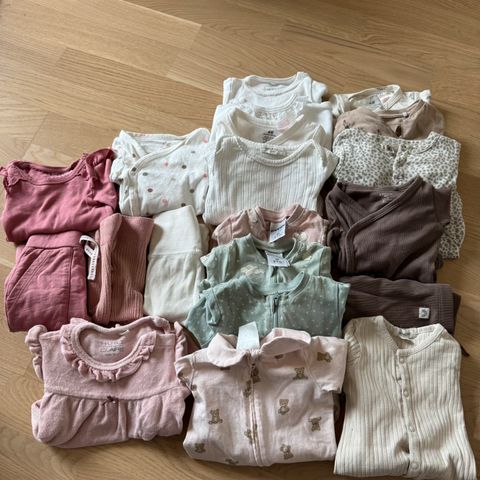 Selger en klespakke med mummi klær. 2 pyjamaser i 56 (en fra moomin og en fra Lindex), 2 nattdrakter i 62 fra moomin og en genser i 62 fra moomin.