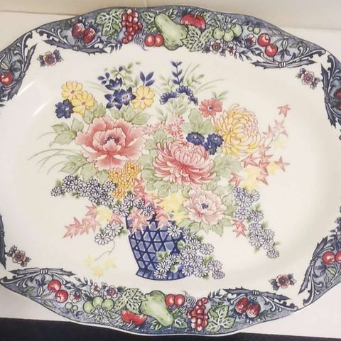 Gammel vakker oval tallerken med lokk og porselensdekor, laget i Italia.