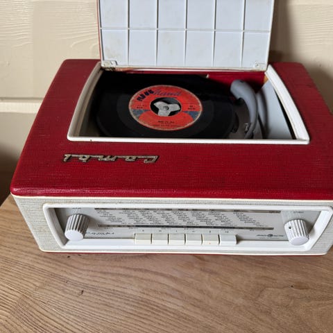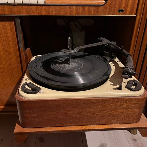 Philips HN333A platespillere. Den blå har original høyttaler-ledning med bananplugger. Den brune i finér har ettermontert ledning med jack-plugg. Den blå har intakt pickup og stift, men får ikke lyd ut. Motor fungerer. Den brune har også fungerende motor, men mangler stift, og noe må fixes i festet til pickuparmen. Har derfor ikke fått testet lyd ut. Begge ser meget pene ut.