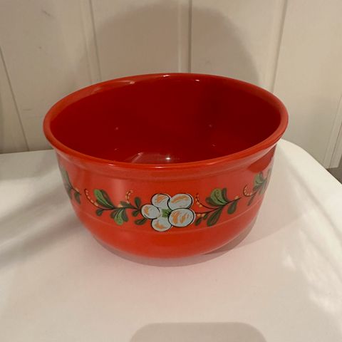 Klassisk keramikk bakebolle, "No5" ,fra 1940/50-tallet, god stand,kun et mini skår i kanten( se bilde),34.5cm dia, rommer 6 liter opp til nederste gule dekorstrek. Selges kr 1300, MÅ hentes i Bærum øst, (sender ikke, hverken på ene eller andre måten.)