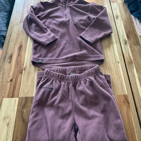 Ikke synlig brukt fleecetøy. Buksa er brun og jakka er i en rosa tone.