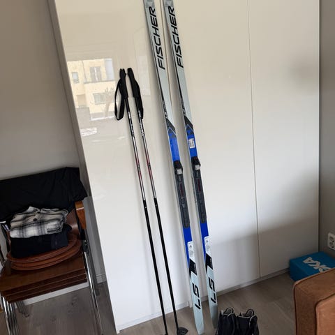 Smøreski fra Fischer med rottefella binding og staver fra Swix. Skiene er 202 cm og stavene er 145 cm (jeg er 180 cm høy). Må hentes ved kjøp.
