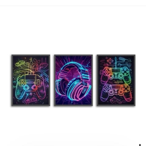 3 lerretsbilder 30x40 med gaming-motiv i ulike farger - bildene er rammet inn i Ikea-rammer med plastglass