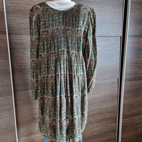 Kjole i mykt og behagelig stoff. Kjolen er mønstret i sort og flaskegrønt, og har deilige stikklommer. Kjolen er figursydd uten å være figurnær. Kjolen kan være et "koseplagg" samtidig som man med sorte strømpebukser og sorte støvletter ser kledd og pen ut.