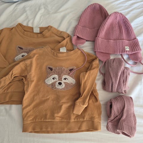 (2 bodier, 2 jeans, 2 ull votter, 2 genser med kaniner og 2 flannel skjorter på bildet er solgt)