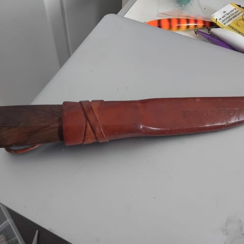 Pent brukt klassiker fra Helle. Godt grep, og sitter svært godt i slire. Litt misfarge på bladet, men ikke noe som går ut over kvaliteten. Se bilder for mål.