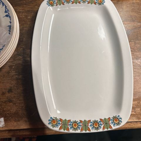 Stort og pent fat med røde roser fra Figgjo. Mål 50-25 cm. Selges 160,- Sender post .