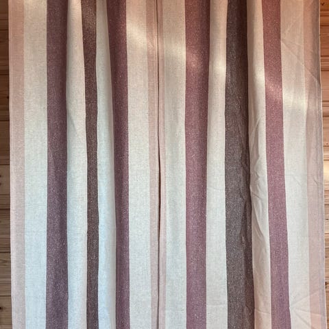 Lange eplegrønne gardiner med messingfargede maljer. To høyder (til ett vindu/dør). Stoffet har "nuppe-struktur" Ny pris 800 kr.