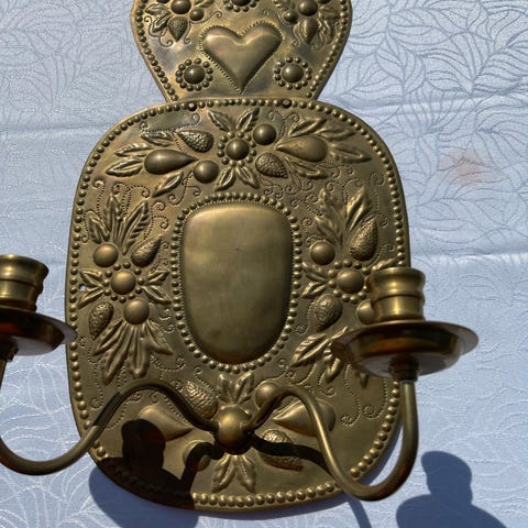 Flott antikt lysskjold i kobber som en gang har hatt holdere til stearinlys, men som nå har fått montert elektrisk fatning. Det elektriske er jordet bakpå, og det er montert ny solid ledning med nytt støpsel og stilig gammel bryter. To helt nye dekorpærer følger med. Nydelig dekor på skjoldet, som ganske sikkert er håndlaget. Det måler ca 42x28 cm - stemningsskapende og dekorativt 😊
