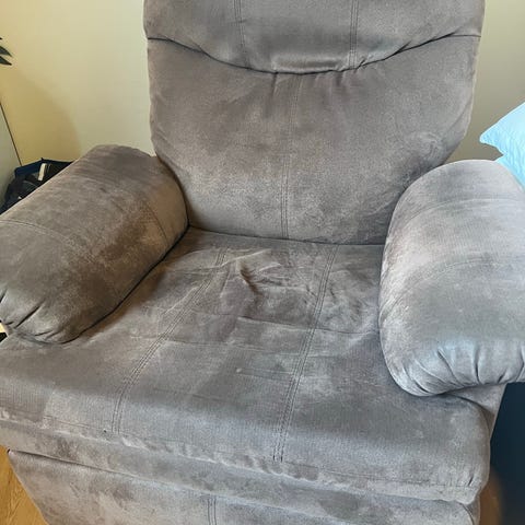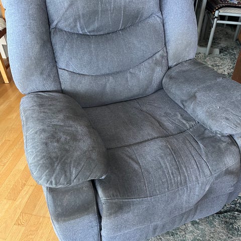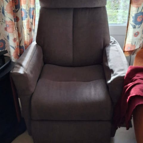 Ukjent merke og modell lenestol med brun mønstret stofftrekk. Lenestolen har polstrede armlener og ryggstøtte, egnet for en person. Stoffmaterialet har et geometrisk mønster og gir en komfortabel sitteopplevelse.