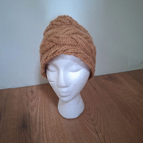 Håndstrikket pannebånd med hundemotiv i svart og hvitt.
