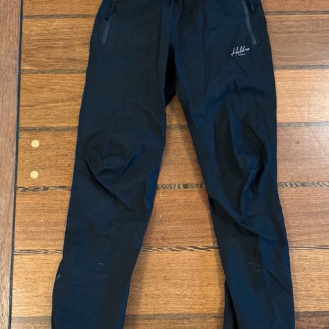 Svart regnbukse / skallbukse (med tapede sømmer) fra Heldre. Nesten ikke brukt, men har en rift på kneet som har blitt reparert med reparasjonslapp beregnet på yttertøy. Sidelommer med glidelås, stramming i livet, og glidelås nederst på beina om en trenger større vidde til for eksempel tursko, slalåmsko eller lignende. Litt liten i størrelsen.