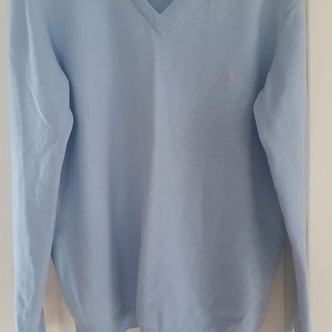 Genseren er ikke stor I str. Ca 44/ 46. Den er pent brukt og har en avstemt grønnfarge. Ull.