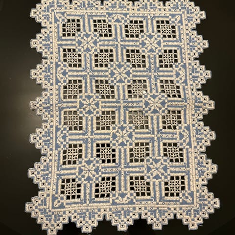 Søt brikke i hardangersøm, hvitt broderi på hvit bunn.
