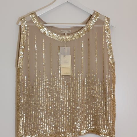 Toppen har et merke øverst på den lilla bakdelen, hvor fargen er litt mørkere. mest sannsynlig etter et klesmerke som er tatt av. Se bilde. Fremstår ellers som fin og lite brukt! Kan strykes :)