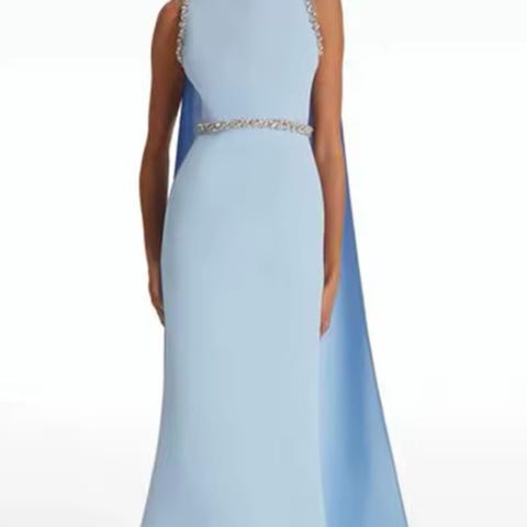 Helt ny og ubrukt kjole i str. S. Lukkes med glidelås bak. Båndene som knytes rundt halsen kan legges i kjolen, like fin uten. Spiler i front på kjolen. Underskjørt følger med. Lett og behagelig kjole å ha på. Jeg er 157 og har på 9 cm høye heler.