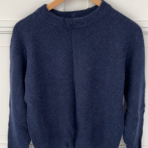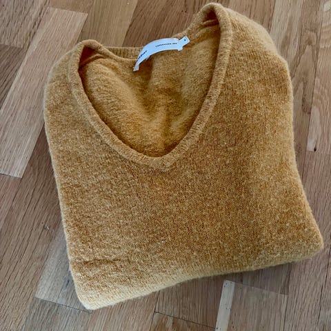 Okergul genser i 38% alpaca, 25% ull, 32% polyamid og 5% elastan str M, brukt en gang selges kr 300,-