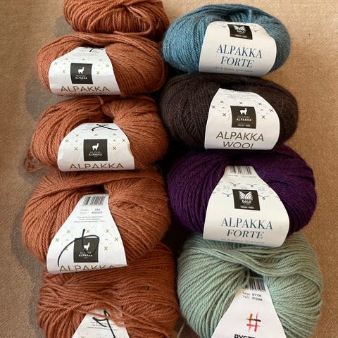 garn / alpakka / du store alpakka / DSA / rød / offwhite / lysegrå / grå / melert / smetteskjerf / pulsvanter / vanter / votter / skjerf / lue