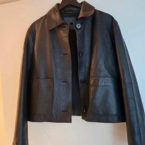 Eksklusiv skinnjakke fra Sylvie Schimmel Paris. Supermykt lammeskinn. Rene linjer og feminint snitt. Sitter veldig pent. Høy kvalitet og godt håndverk. Kun brukt få ganger, framstår som ny.