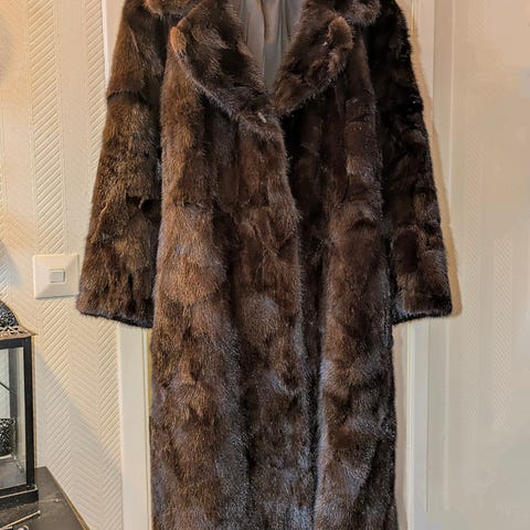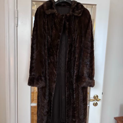 Selger en fantastisk flott og ærverdig lang pels kåpe i 100% ekte Mink med stor krave. Lekker kåpe som varmer godt, og ser utrolig flott ut på - lukket og åpen. Skjulte hemper i front hele veien. Ca 150cm lang og muligens størrelse Medium. Detaljert og pent dobbelt silkefór på innsiden. Relativt hel og pen kåpe men har antyding til slitte ermer og mangler bittelitt pels på den ene lommen - dette er ikke sjenerende og synes ikke spesielt godt ved bruk - mest i blitsen på bilder. Det lages ikke lenger klær av Mink i Norge, så det vil ikke lenger være overflod av kåper igjen.