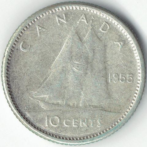 Canada 1957 10 cent mynt laget av 80% sølv. Mynten viser et seilskip "Bluenose" på forsiden og portrett av Elizabeth II på baksiden. Egnet for samlere av historiske mynter.