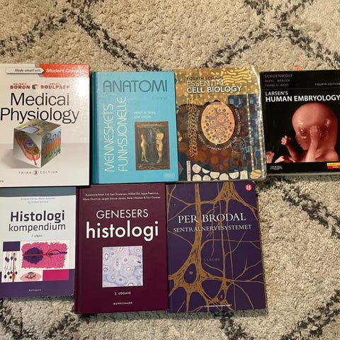 Bøker til hele medisinstudiet eller andre helsefag. Pent brukt, hovedsakelig uten markeringer.