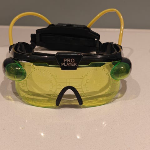 FØLGER MED OM ØNSKELIG: Spy x night mission briller. Brukt. OBS BATTERI SYRE. Ikke utenpå men inni. Men funker. Lyser blått i de to små «hullene» Brukes i mørket, da ser du det blåe lyset. 3stk aaa batterier følger med. 300-400 nypris.