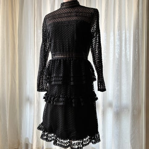 Nydelig fotsid lang sort Festkjole med 2lag kjole hvorav ytterdel er i sort tyll, langt sort tyll bånd bak som knytes over skjult glidelås. Den har et nydelig påsydd pynt foran under bryst i forskjellige stener som blir prikken over i’en. Kvalitet og fremstår nesten som ny, brukt kun ved en anledning. Str L veil.kr 4.000,- Selges kun kr 1.000,-(14)