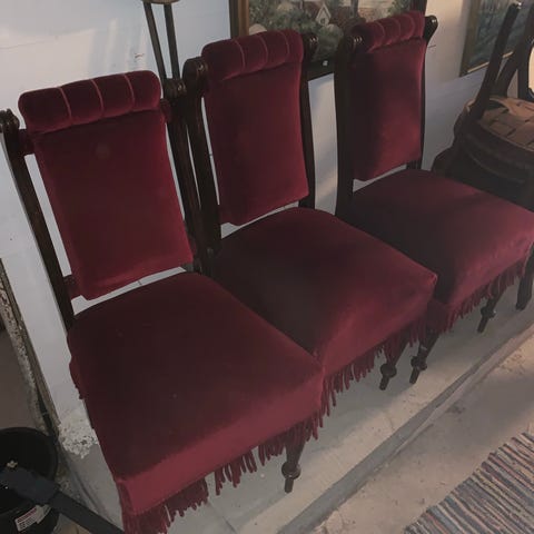 Selger et park stoler i heltre, eik. Kan lett trekkes om. Noe patina og merker. Setene er ikke festet til stolen. Mer rødlig i virkeligheten en det som fremstår på bildet. sittehøyde 46 cm
