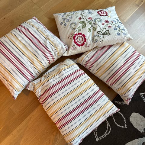 Nydelig Manuel Canovas Ballon serie med beige bakgrunn. Fire puter, to store og to små med rosa lim bakgrunn. To gardiner- ca.2.40 lengde men man kan sy på kant f.eks fløyel eller lin nederst om man har høyere tak.
