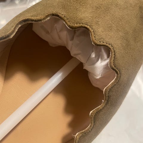 Nye i eske. Høyre skoen er den skoen som har stått utstilt i butikk og er prøvd på.
