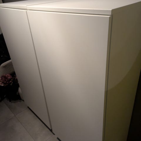 Pent brukt Bestå skjenk, ny i 2023. Har fire hyller, to på begge sider. «Stoppere» slik at dørene på skapet ikke slenges igjen. Må hentes.
