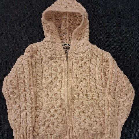 Hjemmestrikket hals med katter. Det hvite garnet er i Sandnes duo og det lilla i merinoull. Halsen sitter fint over skuldrene. Helt ubrukt.