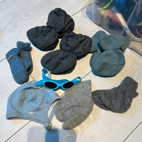 Vinterpakke inneholder: Luer, votter, tøfler, strikkesokker, ullsokker, strømpebukser, vest, overtrekksdresser; en i ull og en i bomull. 300 kr