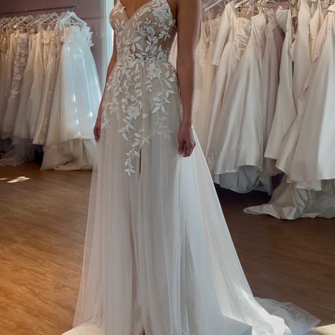 Behagelig kjole med langt slep, hempe til å feste slepet opp ved f.eks dansing. Nydelige blonder på overdelen som glitrer, det kommer desverre ikke godt frem på bildene.