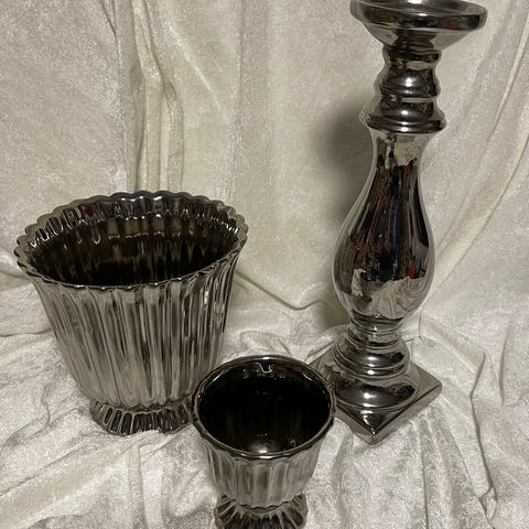 Pen potteskjuler og lysestake , håndmalt, fra sinclair i Larvik.