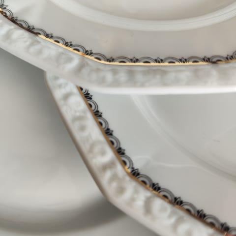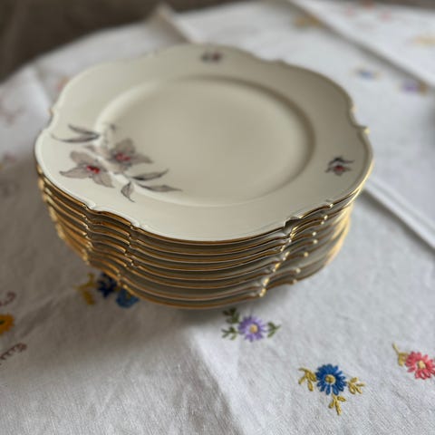 9 stk i str. 21,5 cm i diameter. En har et skår, men de andre 8 er fine. 400 kr samlet.